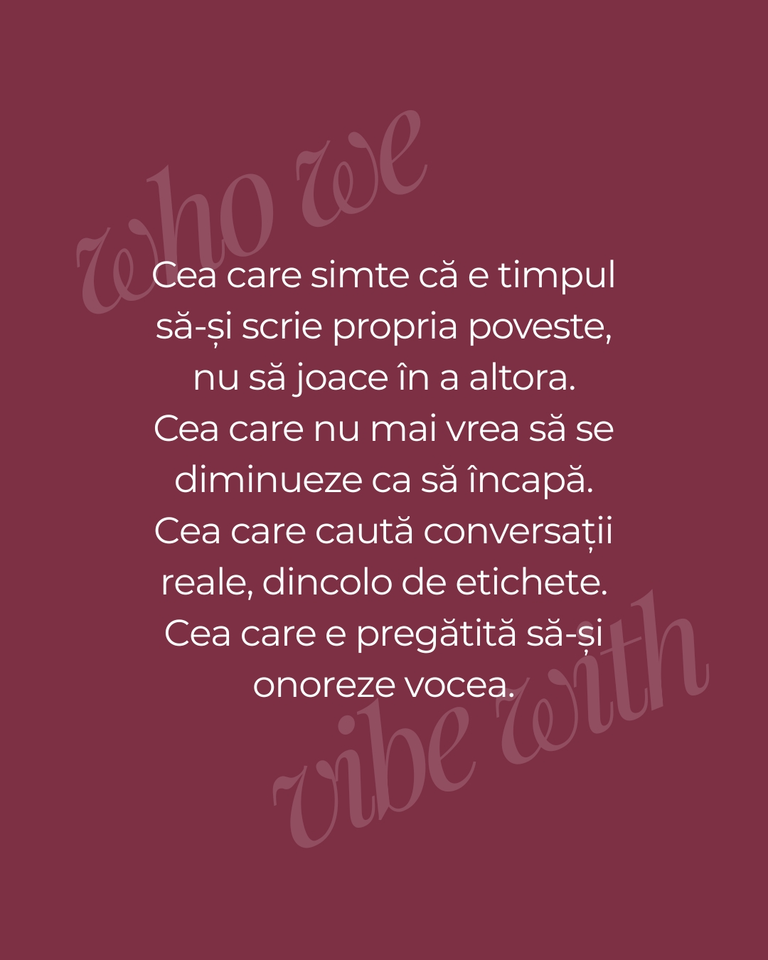 Ne întâlnim pentru a ne vedea dincolo de roluri, pentru a ne valida visele, transformările și neliniștile. Ne vom ține una pe cealaltă de mână atunci când avem de traversat. Pentru a crește împreună, fără comparații, fără măști și fără grabă, alătură-te comunității.